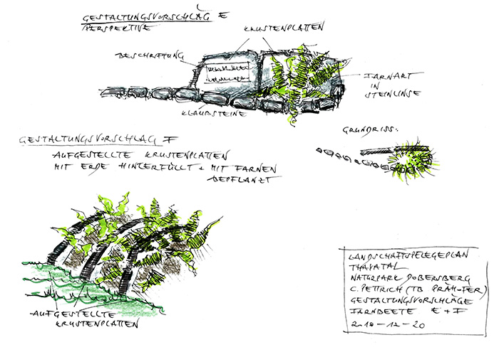 Unter Verwendung regionaler Materialien werden die unterschiedlichen Farn-Arten und charakteristische Elemente der Farnschlucht „gerahmt“ und präsentiert. Mit der Gestaltung neuer, kreativer und interaktiver Infotafeln wird die Art der Wissensvermittlung an den heutigen Standard angepasst.