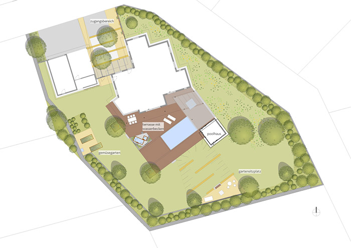 Gestalterische Konzepte wurden für den repräsentativen Zugangsbereich, die Terrasse mit Pool und anschließenden Gemüsegarten als hausnahen Hauptaufenthaltsbereich, einen alternativen Gartensitzplatz im hinteren Teil des Gartens sowie einen eher extensiv genutzten Teil mit Obstbäumen und Blumenwiese erarbeitet.