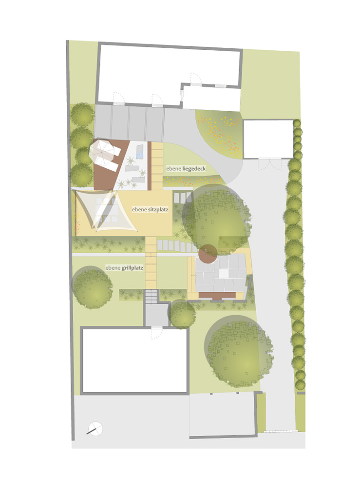 Auf der höchsten und dem Wohnhaus am nächsten gelegenen Ebene entsteht ein intensiv gestalteter Bereich mit Steingarten und Holz-Liegedeck. Daran anschließend wird auf der mittleren Niveaustufe ein gemütlicher Sitzplatz mit Sonnensegel und Rankspalier errichtet. Auf der dritten Niveaustufe ist ein eher wilder Grillplatz mit Feuerstelle und Sitzmauern geplant. Aus roh behauenen, aufgestellten Krustenplatten im Wechsel mit geradlinigen Sichtbetonfertigteilen besteht der Sichtschutz, der den Bereich zur Straße abschirmt.