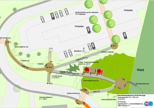 Auch die Besucherleitung vom Parkplatz zu diesem zentralen Eingangsbereich wird klarer definiert. Die neue Gestaltung trägt, über den sicht-begrenzenden Hang hinweg, durch den Einsatz von leitenden Elementen wie Mauern und Gehölzpflanzungen zur Orientierung bei.
