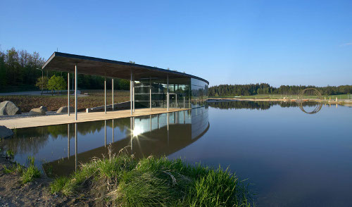 Der schlichte, sichelförmige Baukörper aus Sichtbeton (dunkelgrau eingefärbt), Glas und Holz fügt sich subtil in den Landschaftsraum des angrenzenden Freigeländes. Nach der Durchquerung eines Gräsermeeres beeindruckt der Eingangsbereich, dessen Bodenniveau sich barrierefrei auf der Ebene des Wasserspiegels des angrenzenden Teiches befindet. Das Gebäude scheint mit dem Gewässer verschmolzen. Der gebäudenahe Teil der eintrittspflichtigen Außenanlage besteht aus einer Abfolge von puristisch gestalteten Pflanzterrassen, in denen die Pflanzengemeinschaften der einzelnen Verlandungszonen von Stillgewässern anschaulich präsentiert werden. Sie werden durch einen Holzsteg erschlossen. In größerer Entfernung vom Hauptgebäude werden die Formen weicher und runder, eine naturnahe Gestaltung soll die optische Eingliederung in die umgebende Landschaft erleichtern. Weitere Attraktionen sind ein Fischottergehege und drei Floßabschnitte zur Erkundung der Ufer, von denen einer durch einen im Wasser stehenden Weidentunnel führt.