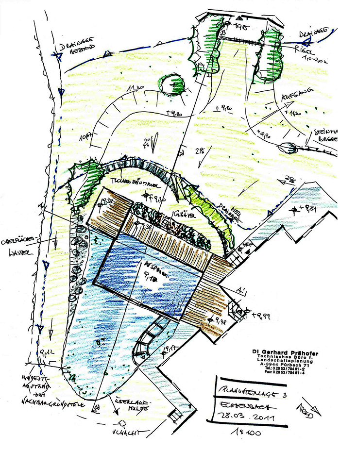 Die Anlage eines Schwimmteiches und eine bessere Anbindung an den, zum Gebäude hin abfallenden, Garten waren die Wünsche zur Neugestaltung dieser Gartenanlage.